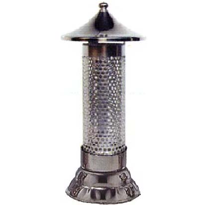 お墓用に使用される灯明(ローソク立て)です。 風防がある事で風が吹いても火が消えにくい構造です。 台座と風防ははめ込み式で簡単に取り外す事が出来るので簡単にローソクが立てられ清掃が容易です。 星ステンレス火屋付ローソク立は中国製の安価タイプでお求め安い価格のローソク立てです。 取付は底部に取付用の突起(埋込部)が付いていますので突起が入る穴を開けて接着剤等で固定してください。 【材質】 18−8ステンレス製 |